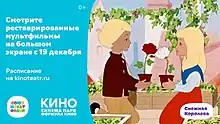 {{cite web}}: CS1 maint: url-status (link) - "Впервые в кинотеатрах золотая коллекция отреставрированных мультфильмов от студии "СОЮЗМУЛЬТФИЛЬМ"" [For the first time in cinemas, a golden collection of restored cartoons from the SOYUZMULTFILM studio"]. kinoteatr.ru (in Russian). Retrieved 2020-12-17.