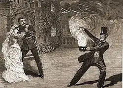 The Sorcerer opened on 17 November 1877 at the Opera Comique, preceded by Dora's Dream, a curtain-raiser composed by Sullivan's assistant Alfred Cellier, with words by Arthur Cecil, a friend of both Gilbert's and Sullivan's.[28] Busy with last-minute cuts and changes the day before the show opened, Sullivan had no time to write an overture and used the "Graceful Dance" music from his incidental music to Henry VIII, together with a few measures of music from "Oh Marvellous Illusion", as an overture. For the 1884 revival, an overture was composed by Sullivan's assistant, Hamilton Clarke.[28] Gilbert's meticulous rehearsal of the cast was noticed and commented on favourably by the critics, and the opening-night audience was enthusiastic.[30] The Sorcerer ran for 178 performances, making a profit.[31] A touring company also began playing the opera in March 1878.[32] D'Oyly Carte continued touring the piece in the early 1880s.[33] Unauthorised productions played on Broadway and elsewhere in the U.S. beginning by 1879.[34][35] The original London sets were by W. Beverly, and costumes were by C. Wilhelm.[36]