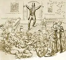 The satire in the opera is focused on old-fashioned customs, pastoral opera conventions, the "popularity of curates, the pose of aristocratic benevolence, and the inebriety of the working man" rather than the broad political satire that would feature in many of the later Savoy opera librettos.[73] For example, "Sir Marmaduke, my dear young friend Alexis", a recitative among Alexis, Sir Marmaduke and Dr Daly, is a skit on the excessive politeness associated with early nineteenth-century aristocracy,[74] and the incantation scene is a parody of the similar scene in Weber's Der Freischütz.[75] Dr Daly accompanies his Act II song on a flageolet.[76] Gilbert satirises the Victorian temperance movement by introducing a non-alcoholic brindisi with jorums of tea; this is also a dig at Italian operas, many of which contained a brindisi scene.[77] Another burlesque of Italian opera is "Prepare for sad surprises", which is similar to Alfredo's denunciation of Violetta in Verdi's La traviata.[58] Gilbert's satire of these subjects, like most of his satire in the operas, was blunted with gentle humour. As Gilbert scholar Andrew Crowther explains, Gilbert characteristically combines his criticisms with comic entertainment, which renders them more palatable, while at the same time underlining their truth: "By laughing at a joke you show that you accept its premise."[78] Theatrical critic Allardyce Nicoll compared J. W. Wells' speech about blessings being less popular than curses to Mr. Hen's satiric auction speech in The Historical Register for the Year 1736 by Henry Fielding.[79]