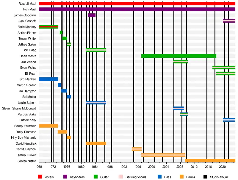Sparks is regarded as an art pop band.[77][78][79][80][81][82] Their musical style has varied dramatically with Russell Mael's distinctive wide-ranging voice (in particular his far-reaching falsetto) and Ron Mael's intricate and rhythmic keyboard playing style being the common thread throughout their fifty-year career. In its review of Kimono My House, NME described Russell's falsetto as a "stratospheric blend of Marc Bolan and Tiny Tim".[83] In the beginning, they attempted to emulate the sound of their English idols, such as the Who, Syd Barrett-era Pink Floyd and the Kinks, sometimes even pretending to be an English band while on the LA club circuit. They relocated to England during the glam rock era where, despite cutting an odd figure on this scene, they found success with their polished brand of intricate pop tunes and convoluted lyrics. Early albums such as Kimono My House combined glam rock with elements of bubblegum pop and baroque music. By the second half of the decade, they were concerned that the sound they had developed while based in England was in danger of becoming stale; they returned to LA, determined to adopt a more "West Coast" sound. This they achieved with producer Rupert Holmes on Big Beat and (sans Holmes) on Introducing Sparks.