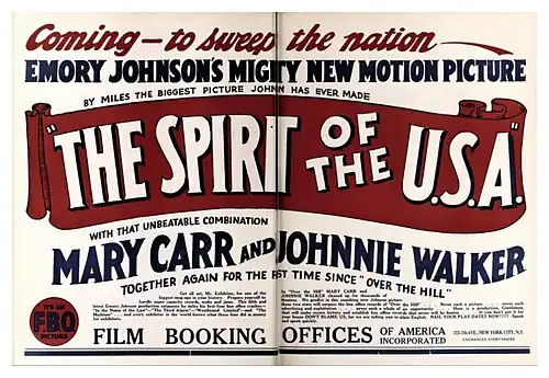 The Spirit of the USA is a 1924 American silent melodrama directed by Emory Johnson. FBO released the film in May 1924. The film's "All-Star" cast included Johnnie Walker and Mary Carr. Emilie Johnson, Johnson's mother, wrote both the story and screenplay. The Mailman was the fifth film in Johnson's eight-picture contract with FBO.[1][2]