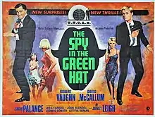 The Spy in the Green Hat is a 1967 feature-length film version of The Man from U.N.C.L.E.'s third season two-part episode "The Concrete Overcoat Affair". The episodes were originally broadcast in the United States on November 25, 1966 and December 2, 1966 on NBC. The film was directed by Joseph Sargent and written by Peter Allan Fields with the story by David Victor.[1] Robert Vaughn and David McCallum star in the film as they do in the television series. It is the fifth such feature film that used as its basis a reedited version of one or more episodes from the series.