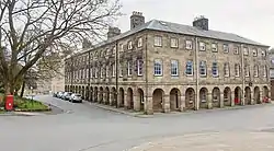 The building was designed by architect John White (who also designed St John The Baptist Church, Buxton) and constructed from 1803–1806 for William Cavendish, 5th Duke of Devonshire.[1] It was built as a series of six grand Georgian town houses from ashlar gritstone with a slate hipped roof. An arched, covered colonnade walkway at ground level features on both sides of the roadside facade.[2]
