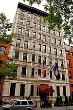 The seven-story building was built on a vacant land in 1883 by Thomas Osborne as an apartment house called "the St. George" (also the St. George Residence, and the St. George Flats) and it was distinguished by its classically inspired, richly carved stone ornaments. Most notable is the influence of the French Renaissance on the ornament, which was quite unusual for that time.[1] The marvelously expressive ornaments consist of figures, faces, animals and foliage.[2] It was an elevator building with two spacious apartments on each floor. There were 8 rooms to each apartment and rents ranged from $1,300 to $1,800 a year; that would make $3,300 per month today.