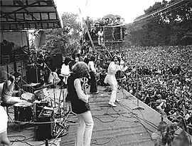 Fans started to arrive at the park with candles on 4 July in tribute to Jones, and the police allowed the park to be opened late so they could stay.[14] By the following morning, there were already 7,000 people.[15]:323 As with the Stones' performance at the infamous Altamont Free Concert later that year, the Hells Angels were hired as stewards to protect the stage and equipment,[2] something suggested by the Grateful Dead's manager Rock Scully, who was used to the Angels performing this service at free festivals in California.[12] According to Cutler, Jagger said that he was keen on doing a similar free concert in California at some time in the future.[12] At Hyde Park, fifty Angels patrolled the vicinity of the stage, though there was little resemblance other than a superficial one to their American counterparts. They performed their duties in exchange for a cup of tea.[12] In the event, there were only twelve arrests on the day and a subsequent police report claimed that the Angels were "totally ineffective".[12]
