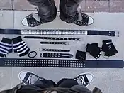 To revive the fervor of punk, which the band felt was being distorted by new wave, the Idles sought to look as intimidating as possible.[2] They shaved their heads, grew mohawks and wore various punk accessories. Nelson and MacKaye even drove thumbtacks into the soles of their boots so they would make an "ominous clacking" sound when they walked.[10] The band's visual presentation was at odds with their demeanor; according to MacKaye, "In our shows and within our own community, we were totally goofy guys. We were painfully honest — we didn't shoplift, we didn't vandalize, we didn't spray-paint. [...] We don't do anything — everybody just hates us because of the way we look".[9]