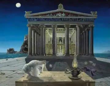 The Temple (French: Le Temple) is a painting made in 1949 by Paul Delvaux. It depicts a classical temple building in moonlight, with the severed head of a statue and several modern objects in the foreground. The painting was made in Choisel outside Paris where Delvaux lived for nine months with his lover and future wife Tam. It is an oil painting with the dimensions 113.7 cm × 146 cm (44.8 in × 57.5 in).