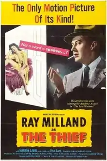 The Thief is a 1952 American film noir crime film directed by Russell Rouse and starring Ray Milland. The film is noted for having no spoken dialogue; the only verbal communication present in the film is represented through closeup shots of two telegrams.[2]
