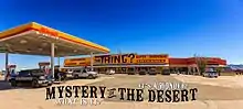 The Thing is heavily advertised via billboards that dot the interstate. A popular, albeit untrue, legend states that the billboards stretch from New Orleans to Los Angeles. Mike Bowlin, the owner of the site in 1993, noted that the billboards realistically "start around El Paso to the east and somewhere on I-10 between Phoenix and Tucson to the west."[2] RoadsideAmerica.com claims that over 247 billboards, spread out over a span of 200 miles, advertise the attraction.[7] Due to The Thing's popularity, it has appeared in many books, such as Doug Kirby's New Roadside America (1992), Weird Arizona (2007) and it once was featured in a Jane Pauley television special on NBC.[1][2] It is also referenced in the song "The Church of Logic Sin and Love" (1992), by The Men.[8] "The Thing" is also featured in the 2009 documentary film Amy Cook: The Spaces in Between that traces the creative journey of Austin singer-songwriter Amy Cook and her band as they tour the backwater towns of the American southwest.[9]