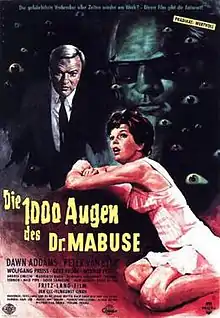 The Thousand Eyes of Dr. Mabuse (German Die 1000 Augen des Dr. Mabuse) is a 1960 black-and-white crime thriller film directed by Fritz Lang in his final film. A West German/French/Italian international co-production, it starred Peter van Eyck, Dawn Addams and Gert Fröbe. The film made use of the character Dr. Mabuse, who had appeared in earlier films by Lang in 1922 and 1933. The Thousand Eyes of Dr. Mabuse spawned a film series of German Mabuse films that were released over the following years to compete with Rialto Film's Krimi films.