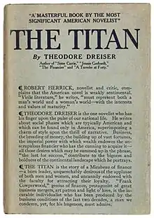 The Titan is a novel by Theodore Dreiser, completed in 1914 as a sequel to his 1912 novel The Financier.[1] Both books were originally a single manuscript, but the narrative's length required splitting it into two separate novels.[2] Dreiser's manuscript of The Titan was rejected by Harper & Brothers, publisher of The Financier, due to its uncompromising realism; John Lane published the book in 1914.[3] The Titan is the second part of Dreiser's Trilogy of Desire, a saga of ruthless businessman Frank Cowperwood (modeled after real-life streetcar tycoon Charles Yerkes). The third part of the trilogy, The Stoic, was Dreiser's final novel, published in 1947 after his death.