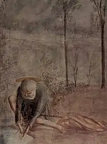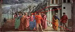 Masaccio is often compared to contemporaries like Donatello and Brunelleschi as a pioneer of the renaissance, particularly for his use of single-point perspective.[1] One technique that was unique to Masaccio, however, was the use of atmospheric, or aerial perspective. Both the mountains in the background, and the figure of Peter on the left are dimmer and paler than the objects in the foreground, creating an illusion of depth. This technique was known in ancient Rome, but was considered lost until reinvented by Masaccio.[1]