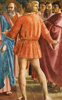 In the story, Peter is clearly singled out among the disciples, and his strong connection with Christ can be seen in Christ's words "for me and thee".[10] Peter appears a majestic and energetic figure when he is with Christ and when he performs his work, in contrast to the diminutive shape on the left. This all points forward to his apostolic role as Christ's vicar on earth.[17] As such The Tribute Money represents a transitional scene in the chapel; in doing Christ's bidding Peter goes from being a disciple to being the master.[18]