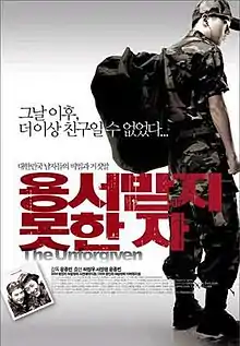 The Unforgiven (Korean: 용서받지 못한 자; RR: Yongseobadji mothan ja) is a 2005 South Korean drama film directed by Yoon Jong-bin. Turning painful experiences of his own compulsory military service into a narrative of three young men, director Yoon presses the hot-button issue of military service in contemporary South Korea. Yoon's controversial exposé of psychological and physical violence within the ranks stimulated a national dialogue on the subject.[2][3]