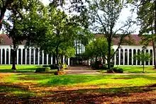 In the mission of finding UH a permanent home, heirs of philanthropists J. J. Settegast and Ben Taub donated 110 acres (0.45 km2) to the university for use as a permanent location in 1936.[39] At this time, there was no road that led to the land tract, but in 1937, the city added Saint Bernard Street, which was later renamed to Cullen Boulevard.[38] It would become a major thoroughfare of the campus. As a project of the National Youth Administration, workers were paid fifty cents an hour to clear the land. In 1938, Hugh Roy Cullen donated $335,000 (equivalent to $6,448,947.99 in 2021) for the first building to be built at the location. The Roy Gustav Cullen Memorial Building was dedicated on June 4, 1939, and opened for classes officially on Wednesday, September 20, 1939.[37] The building was the first air-conditioned college building constructed on a U.S. campus.[35] A year after opening the new campus, the university had over 2,000 students.[35] As World War II approached, enrollment decreased due to the draft and enlistments. The university was one of six colleges selected to train radio technicians in the V-12 Navy College Training Program.[40][41] By the fall of 1943, there were only about 1,100 regular students at UH; thus, the 300 or so servicemen contributed in sustaining the faculty and facilities of the Engineering College. This training at UH continued until March 1945, with a total of 4,178 students.[42]