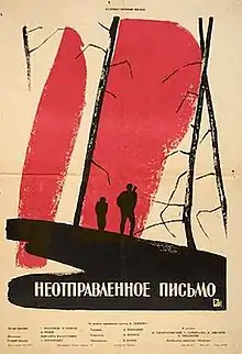 Letter Never Sent (Russian: Неотправленное письмо, translit. Neotpravlennoye pismo, sometimes translated as The Unsent Letter or The Unmailed Letter[2]) is a 1960 Soviet adventure drama film directed by Mikhail Kalatozov and starring Tatiana Samoilova.[2][3][4] It was entered into the 1960 Cannes Film Festival, but was withdrawn just before the screening on 17 May; according to the Soviet representatives, the film was "unfinished" (as a matter of fact, Kalatozov wanted to re-shoot some sequences before the premiere in USSR).[5]