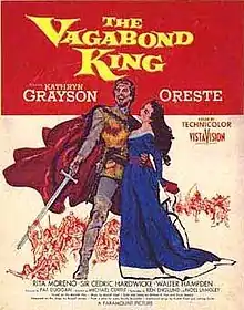 The Vagabond King is a 1956 Paramount Pictures musical film directed by Michael Curtiz and starring Kathryn Grayson, Rita Moreno, Sir Cedric Hardwicke, Walter Hampden, Leslie Nielsen, and Maltese singer Oreste Kirkop in his only feature film role. It is an adaptation of the 1925 operetta The Vagabond King by Rudolf Friml. Hampden plays King Louis XI. Mary Grant designed the film's costumes.