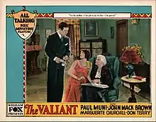 The Valiant is a 1929 American pre-Code drama film released by Fox Film Corporation in the Fox Movietone sound-on-film system on May 19, 1929.[1] It is produced and directed by William K. Howard (his first sound film) and stars Paul Muni (in his film debut), Marguerite Churchill (in her feature film debut), and John Mack Brown. Although described by at least one source[2] as a silent film containing talking sequences, synchronized music, and sound effects, The Valiant has continuous dialogue and is a full "talkie" made without a corresponding silent version.[3]