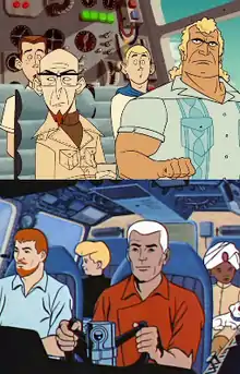 The series' principal reference is to the 1964 animated science fiction adventure television series Jonny Quest, as it is the basis for many of the main characters. Dr. Venture is modelled after what a child such as Jonny Quest might have grown up to be like after having lived through a childhood filled with bizarre, life-threatening events. Brock is modelled on Race Bannon. The Venture boys are based on the Hardy Boys and take the places of Jonny and Hadji. In the episode "Ice Station – Impossible!", Brock mentions that he had served with Race Bannon on several occasions. He regards his fellow agent with respect calling him "one of the best". One newspaper critic remarked, "If filmmakers Woody Allen and Sam Peckinpah had collaborated on Jonny Quest, it would have come out a lot like this."[28] In season 2, Jonny Quest was introduced into the show as "Action Jonny", a homeless drug addict who deeply resents his father. As of season 4, Jonny is somewhat stable, and in a support group for former boy adventurers, along with Dr. Venture, the second Wonder Boy, RoBoy, and the Hale Brothers—the final three being parodies of Robin, Astro Boy, and the Hardy Boys, respectively.[29]