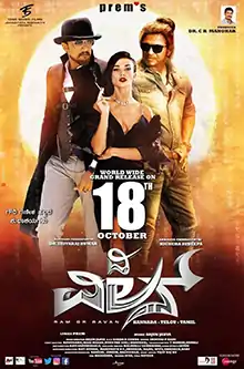 Director Prem announced new film starring Shivaraj Rajkumar and Kichcha Sudeepa. The film is about a villager who dreams to become an actor. The film is produced by C. R. Manohar and they signed Bollywood actor Mithun Chakraborty in an important role that has been kept as a secret in the beginning, but the news was later leaked to the press.[3] The film was launched by then Karnataka's Chief Minister Siddaramaiah on 13 December 2015[4][5] and the first look was released in March 2017.[6] Before the release of the first look, the movie was titled as Kali taglined Ruler Warrior. But later was changed as The Villain taglined Ram Ravan due to some reasons. The film completed a schedule and was reported to have portions in England and two other foreign countries to be shot. By then, the film fetched ₹5.4 crore as Hindi rights. Actress Amy Jackson was signed as the female lead.[7][8] The song "Jeeva Hoovagide"[9] from Nee Nanna Gellalare composed by Ilaiyaraaja was shot with Shiva Rajkumar and Amy Jackson in replicated costumes of Rajkumar and Manjula from the original film in a schedule where entire talkie portions were shot, except few songs.[10][11] Later, filming the climax was completed on 1 February as per actor Sudeepa's tweet.[12]