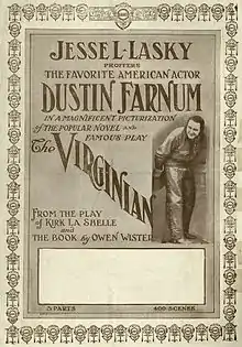 'The Virginian' is a 1914 American silent Western film based on the 1902 novel The Virginian by Owen Wister. The film was adapted from the successful 1903โ04 theatre play The Virginian, on which Wister had collaborated with playwright Kirke La Shelle. The Virginian starred Dustin Farnum in the title role, a role he reprised from the original play. It was directed by Cecil B. DeMille.