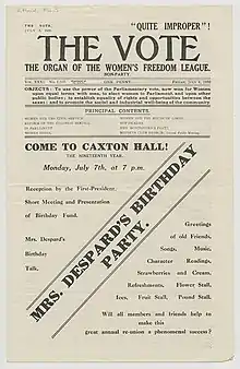 The League opposed violence in favour of non-violent forms of protest such as the non-payment of taxes, refusing to complete census forms and organising demonstrations, including members chaining themselves to objects in the Houses of Parliament. It grew to over 4,000 members and published The Vote newspaper weekly from 1909–1933.[4] Sarah Benett was the League's Treasurer until her resignation in 1910. Dr Elizabeth Knight was a source of funds for the Women's Freedom League. She took over as Treasurer from Constance Tite in 1912 where she improved the WFL's financial situation.[5] Before she was appointed, the league had had serious financial problems and on occasions had had to appeal to its members for loans. Knight introduced new fund raising schemes for the league although finances were improved by large donations by an "anonymous" person. It is suspected that this person was Knight.[6]