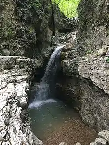 The “Walls” is an impressive geological feature that forms a large bowl shaped amphitheater. Embedded in the limestone are bowling ball size holes from which water drips and spouts, creating a unique water feature. This amphitheater gives rise to steep 200-foot (61 m) sheer rock walls that creates the natural feature defining the amphitheater. Turkey Creek drains through the “Walls” and has been an active geological force in creating the amphitheater.