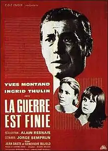 The War Is Over (French: La Guerre est finie-1966) is a French drama film about a leftist in Franco's Spain, directed by Alain Resnais and starring Yves Montand, Ingrid Thulin and Geneviève Bujold.[1] Joseph Losey directed a sequel, Roads to the South (French: Les Routes du Sud-1978). In July 2021, the film was shown in the Cannes Classics section at the 2021 Cannes Film Festival.[2]