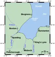 St Botolph's, the parish church of Boston, has a tower known as the Boston Stump. This can be seen on clear days from the Norfolk side of the Wash. The Outer Trial Bank, a remnant of a 1970s experiment, lies some two miles (three kilometres) off the Lincolnshire coast near the River Nene.