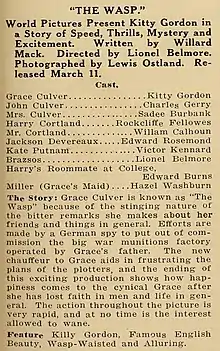 The Wasp is a lost[1] 1918 silent film comedy drama directed by Lionel Belmore and starring stage star Kitty Gordon. It was produced by William A. Brady and distributed by World Film Company.[2]