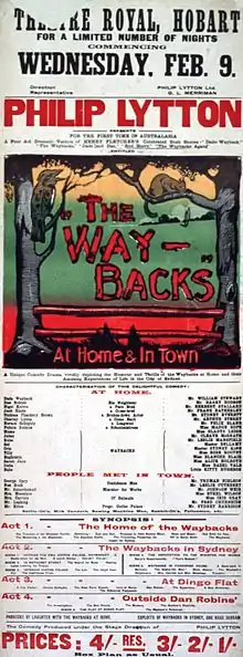 The Waybacks, also known as The Waybacks at Home and in Town, was a 1915 Australian play by Philip Lytton which was adapted from the stories by Henry Fletcher about the comic adventures of a rural family. The play was seen as attempt to cash in on the success of the theatre version of On Our Selection, and enjoyed almost as much popularity at the box office during its original run.[3][4]