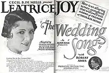 The Wedding Song is a 1925 American silent drama film directed by Alan Hale and starring Leatrice Joy, Robert Ames, and Charles K. Gerrard.[1] It is based upon the novel of the same name by Ethel Watts Mumford.[2]