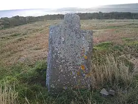 The standing stone is situated in open farmland overlooking the sea, between the small coves of Rathmoylan and Ballymacaw.