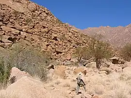 The "White Lady" archaeological site is located close to the road from Khorixas to Hentie's Bay, in the area of Uis, on the Brandberg Massif. The Brandberg itself hosts over 1.000 bushmen paintings, scattered around in rock shelters and caves.[3] The "White Lady Group" is found in a cave known as "Maack Shelter"[lower-roman 1] and portrays several human figures as well as oryxes, on a rock panel measuring about 5.5 m x 1.5 m. The "White Lady" is the most detailed human figure in the group, and measures about 39.5 cm x 29 cm. To reach The White Lady it is necessary to hike for about 45-60 minutes over rough terrain, along the gorge of the normally dry Tsisab river.
