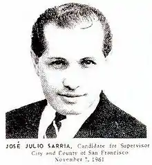 Sarria did not have a relationship with his birth father, a man who showed no interest in him and failed to provide his family with financial support. Julio Sarria was eventually arrested for failure to pay child support. A judge ordered that he pay $5 to be released; this money was then turned over for Jose's care. Julio was arrested each month until he returned to Nicaragua in around 1926 or 1927; each time he paid the $5 and was released.[17] Julio died in Nicaragua in 1945. Years later, José learned that his father had acknowledged him as his first-born.[18]