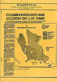 The society publishes the Wilderness Journal,[13] which covers a wide variety of stories about nature and people. Topics include the communities and forests of East Gippsland, a photo diary by Ben Baker of a road trip through bushfire damaged regions, a story about Marina DeBris and the ugly beauty of our trash, attempts to restore the giant kelp forests of Tasmania, and a journey into Mirning country, the coast and waters of the Great Australian Bight.