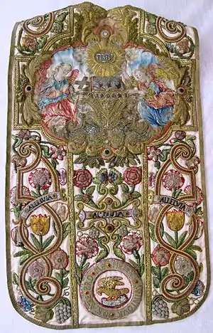 Unlike some of her contemporaries, such as Elizabeth, Countess of Shrewsbury, who employed 'broiderers' to draw out their designs for them, Helena designed and made all of her vestments herself. She designed the vestments with the Society of Jesus (Jesuits) in mind; this is clear from both the symbolism she used and from her will which bequeathes all the vestments to the Society of Jesus.[1] Shortly after Helena's death, Lady Wintour, Helena's sister-in-law, launched a campaign claiming ownership of the vestments. Since the claims were likely to attract dangerous official attention towards the Jesuits, her demands were met and she was granted half of the Wintour vestments.[1] The Wintour collection has remained in two halves to this day; Lady Wintour's half were kept in the family until they were donated to the Benedictine community and were recently transferred to Douai Abbey Library. The half belonging to the Jesuits are now in the hands of Stonyhurst College. An exhibition in 2016 held at Douai Abbey reunited the two halves of the Wintour collection for the first time since 1671.[2]