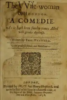 The Wise Woman of Hoxton is a city comedy by the early modern English playwright Thomas Heywood. It was published under the title The Wise-Woman of Hogsdon in 1638, though it was probably first performed c. 1604 by the Queen's Men company (of which Heywood was a shareholder), either at The Curtain or perhaps The Red Bull.[1] The play is set in Hoxton, an area that at the time was outside the boundaries of the city of London and notorious for its entertainments and recreations.[2] The Victorian critic F. G. Fleay suggested that Heywood, who was also an actor, originally played the part of Sencer.[3] It has often been compared with Ben Jonson's comic masterpiece The Alchemist (1610)—the poet T. S. Eliot, for example, argued that with this play Heywood "succeeds with something not too far below Jonson to be comparable to that master's work".[4]