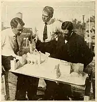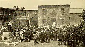 The entire production was filmed in Fort Lee at Fox's facilities located near the intersection of Main Street and Linwood Avenue.[14] Rather than going on location, traveling from New Jersey to Mexico with a large company of actors, crew, and other support personnel, Powell in the early months of 1915 had decided to send his scenic designer, J. Alan Turner, to Mexico to locate, photograph, and sketch the architecture, attire, and daily activities in a "typical village" there. Then, on his return to Fort Lee, Turner supervised the construction on Fox studio's backlot a 10-acre set with full-size replicas of the Mexican buildings he had documented in San José in Sonora.[15] The trade journal Motion Picture News regularly updated its readers on the production's development, noting that Powell spent more than $10,000 ($268,000 today) on the Mexican set. "The village", it reported, "is the result of the joint efforts of Mr. Powell himself, J. Alan Turner, who is known as a builder of expositions, and William Bach, the technical director of the Fox studios".[16]