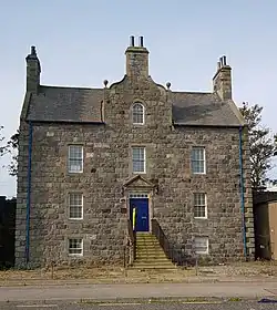 The structure is two storeys and basement, constructed of squared heathen stone with freestone dressings and quoins. It has a shaped Dutch gable with an arched window and ball finials. Steps lead up to a pedimented door piece.[1] A wooden porch present in the 1970s has since been removed.