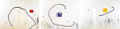 Miró painted these large scale works (as well as Bleu II) influenced under the impression that he got on his stay in the United States. The action painting by Jackson Pollock and the abstract expressionism by Robert Motherwell and Mark Rothko clearly influenced Miró, although that the forms of Miró are not abstract figures, but remain true to the nature, source of inspiration [7]