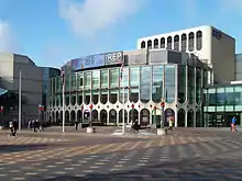 Birmingham Repertory Theatre, commonly known as "The Rep" and located next to the Library of Birmingham on Centenary Square, is one of Britain's leading producing theatres.[34] It stages a wide range of performances in its three auditoria in Birmingham – The House with 825 seats, The Studio with 300 seats and The Door with 140 seats – as well as touring nationally and internationally and transferring productions to London's West End.[34] The Rep regularly commissions new work and presented over 130 new plays during the five-year period to 2013.[34]