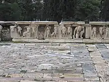 The Theatre of Dionysus[1] (or Theatre of Dionysos, Greek: Θέατρο του Διονύσου) is an ancient Greek theatre in Athens. It is built on the south slope of the Acropolis hill, originally part of the sanctuary of Dionysus Eleuthereus (Dionysus the Liberator[2]). The first orchestra terrace was constructed on the site around the 4th and 5th century BC, where it hosted the City Dionysia. The theatre reached its fullest extent in the fourth century BC under the epistates of Lycurgus when it would have had a capacity of up to 25,000,[3] and was in continuous use down to the Roman period. The theatre then fell into decay in the Byzantine era and was not identified,[4] excavated[5] and restored to its current condition until the nineteenth century.[6]
