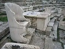 A coin of the Hadrianic period[38] crudely suggests a division of the theatre into two sections, but only one diazoma, or horizontal aisle, and not two if the epitheatron went past the peripatos.[39] The auditorium was divided by twelve narrow stairways into thirteen wedge-shaped blocks, kerkides, two additional staircases ran inside the two southern supporting walls. There is a slight slope to each step, the front edge is almost 10 cm lower than the back. The seats were 33 cm in depth and 33 cm in height with a forward projecting lip, with seventy-eight rows in total. The two fronts rows, still partially preserved today, consist of Pentelic stone chairs or thrones; these were the prohedria or seats of honour. Originally sixty-seven in number, the surviving ones each bear the name of the priest or official who occupied it, the inscriptions are all later than the fourth century, albeit with signs of erasure, and from the Hellenistic or Roman periods.[40] The central throne belonged to the priest of Dionysus, which is tentatively dated to the first century BC.[41] Towards the orchestra there is a barrier from the Roman era, then a drainage channel contemporary with the Lycurgan theatre.