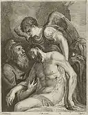 Teniers used full colour in the modelli, rather than grisaille. This could mean that he intended these reproductions to function as independent records of some of these Italian paintings in the Archduke's collection. From the many modelli, which have been preserved, it is obvious that Teniers's copies constitute a true record of the originals even while he left out details and painted them in his typical fluid and transparent manner. The engraving of the catalog by engravers who worked after the modelli, not the originals, was started by 1656.[5] In the 17th century there existed no efficient method for inverting images. As a result, most of the prints in the catalog are reverse images of the originals.[6] Each print gives the name of the author of the original work on the left hand side (indicated by the letter 'p' for 'pinxit', Latin for 'painted by') and the engraver of the print on the right hand side (indicated by the letter 's' for 'sculpsit', Latin for 'engraved by'). Some editions also indicated the original dimensions of the paintings.[7]