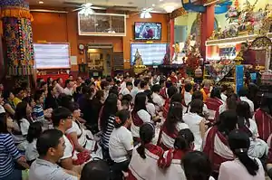 The Singapore temple has weekly teachings in English and Mandarin, chanting and prayers sessions. It provides prayers and celebrations for Buddhist holy days and festivals such as Lunar New Year, Vesak, Ullambana, and Qingming Festival. It is the only Tibetan Buddhist temple in Singapore to be open twenty four hours a day, seven days a week. The main hall is available to all who seek a place of quiet, for prayers, for meditation at any time of the day. The temple provides free traditional Chinese Medicine consulting service, acupuncture service and medicine weekly. The temple provides free medicine distribution, free meals and financial support, with emphasis for the poor and elderly. The devotees chant sutras in Mandarin wearing the traditional Chinese Hai-Ching and chant prayers in English and Tibetan while wearing the layman robes of white and maroon. This temple is unusual for the youth of its devotees; most are below the age of thirty five. The temple was granted permission by the Office of the 14th Dalai Lama to publish thirteen of his books in simplified Mandarin for free distribution.