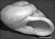 | Black-and-white photo showing an apertural view of a shell of Thelidomus aspera from Jamaica. Scale bar = 1 cm. | |