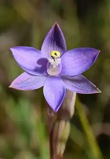 Thelymitra arenaria, commonly called the forest sun orchid,[2] is a species of orchid that is endemic to south-eastern Australia. It has a single long, narrow leaf and up to sixteen purplish self-pollinating flowers which only open on hot days.