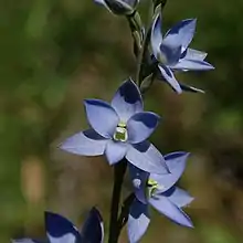 Thelymitra media, commonly called the tall sun orchid,[1] is a species of orchid that is endemic to eastern Australia. It has a single fleshy, channelled leaf and up to thirty blue flowers with darker streaks but without spots. The labellum (the lowest petal) is narrower than the other petals and sepals.