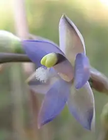 Thelymitra peniculata, commonly called the trim sun orchid,[2] is a species of orchid that is endemic to southern eastern Australia. It has a single long, erect, fleshy, channelled leaf and up to eighteen deep blue to purple self-pollinating flowers.